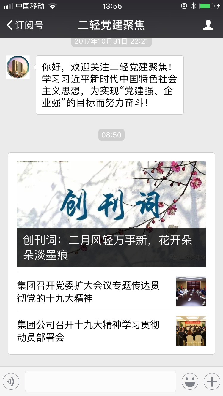 加強(qiáng)黨建工作宣傳有利于統(tǒng)一集團(tuán)上下思想、凝聚黨員群眾力量、傳播企業(yè)文化。在集團(tuán)領(lǐng)導(dǎo)的高度重視和悉心指導(dǎo)下,微信公眾號《二輕黨建聚焦》正式上線運(yùn)行,請二輕全體員工關(guān)注、閱讀、轉(zhuǎn)發(fā)公眾號推送的文章,積極向公眾號投稿或留言,通過全體二輕人共同的關(guān)心和參與,使其成為數(shù)字信息時(shí)代集團(tuán)黨委的喉舌、黨建宣傳的窗口。